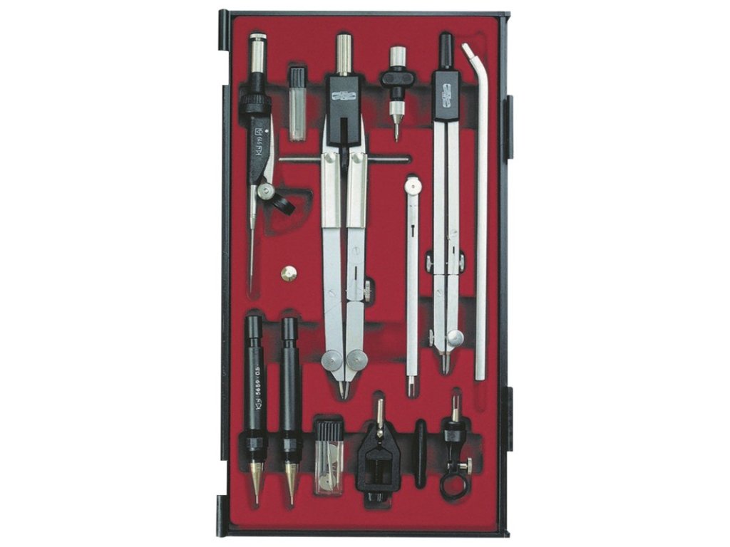 - Souprava je složena z kružidla rychlonastavitelného, kružidla s teleskopem, padacího nulátka pro trubičková pera, ramena prodlužovacího, tyče prodlužovací a běžcem, nástavce kružidlového a adaptéur univerzálního, šroubováku s držákem, středovky, automatické tužky, tuženky a pouzdra s náhradními součástkami.