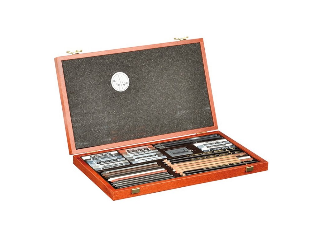 - Souprava obsahuje 40 ks různých uměleckých tužek , tuhy a kříd vysoké kvality v dřevěné kazetě :