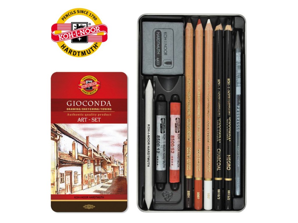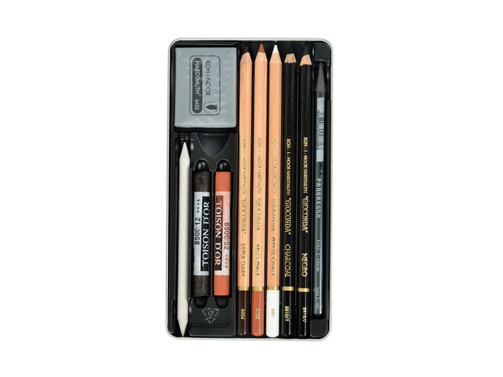 Sada obsahuje:tužku Progresso 6BNegro tuhu v tužce - tvrdost 2umělý uhel v tužce - tvrdost 2bílá křída v tužce2 x sépie v tužce2 x kulaté soft pastely (prašné křídy)roztírátkotvárlivou pryž ve fólii.Rozměr kazety 18 x 10 cm.Doporučeno použít pro naprosto jakoukoli kresbu.