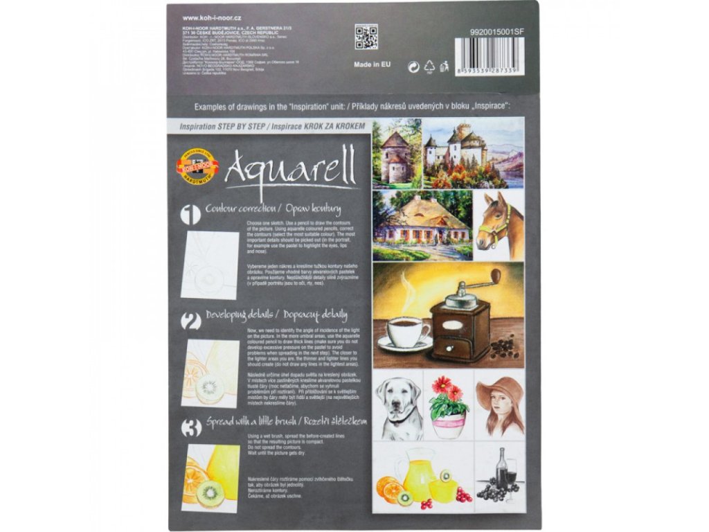 - Na přední obálce v horní části mašle, název Aquarell inspiration, barevný motiv, formát A4 – 20 listů, 250 g/m2.