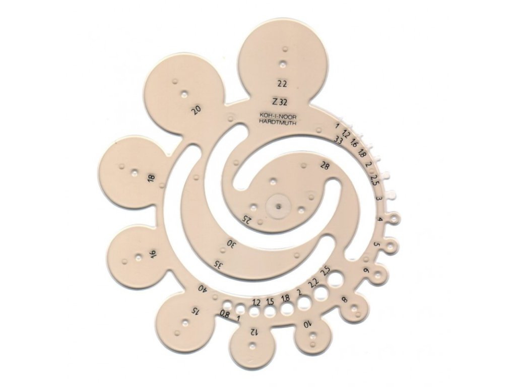 - Obsahuje kružnice o průměru 0,8 – 2,5 mm a rádiusy 1 – 40 mm. Velikost kružnic a radiusů je označena černým sítotiskem, který je při běžném používání odolný proti opotřebení.