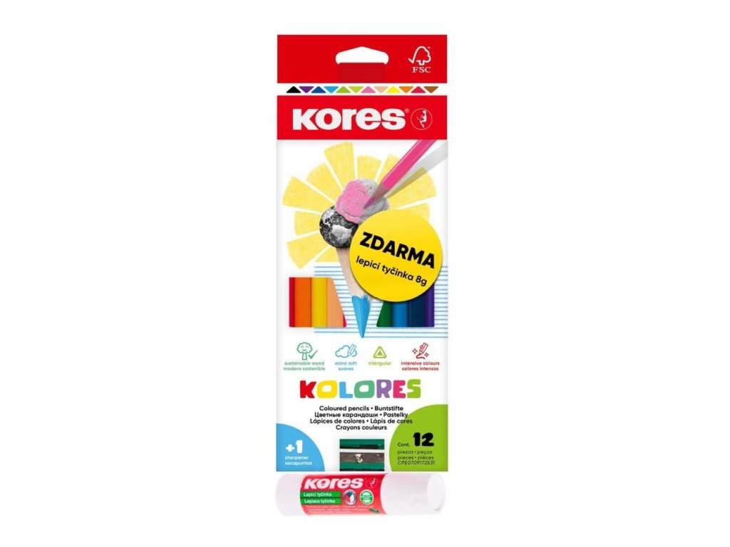 - Limitovaná edice - 12 trojhranných pastelek Kolores od značky Kores a k tomu ZDARMA 1 x lepidlo Kores 8g
