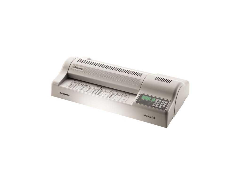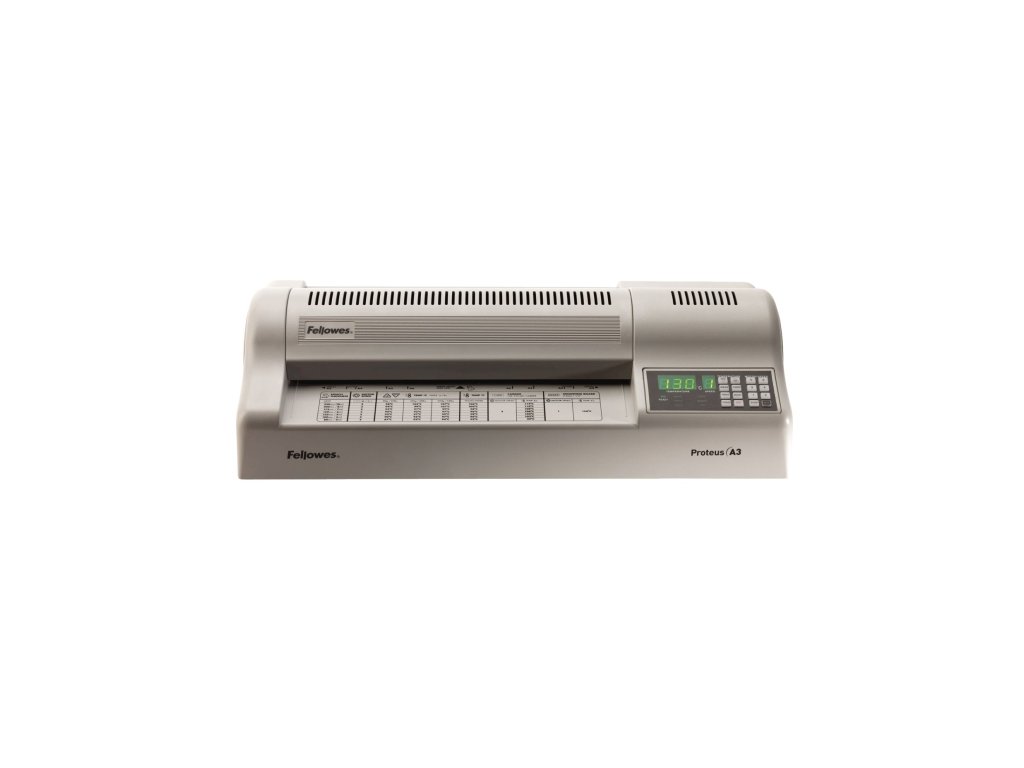 Laminátor Fellowes Proteus A3 je profesionální zařízení navržené pro vysoké pracovní zatížení a precizní laminaci dokumentů až do formátu A3. Disponuje šesti laminovacími válci, z toho čtyřmi vyhřívanými, což spolu se speciální technologií rovnoměrného ohřevu kondukčním topidlem zajišťuje špičkovou kvalitu laminace bez nerovností či bublin. Je vhodný i pro laminaci fotografií a plnobarevných tiskovin.