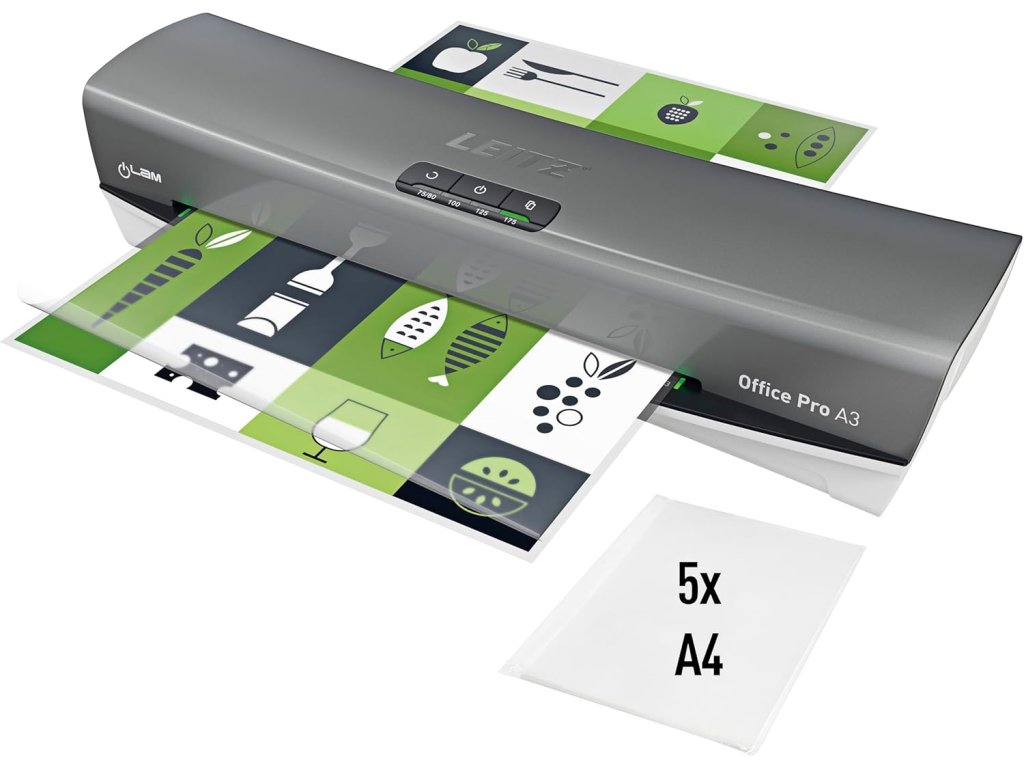 Laminátor Leitz iLAM Office Pro A3 slouží k ochraně dokumentů, oznámení, směrnic, výukových materiálů i fotografií pomocí laminovacích kapes až do formátu A3. Přístroj nabízí rychlé zahřátí a stabilní výkon pro každodenní kancelářské použití. Díky řízené rychlosti a systému 4 válců zajišťuje rovnoměrnou kvalitu laminace.