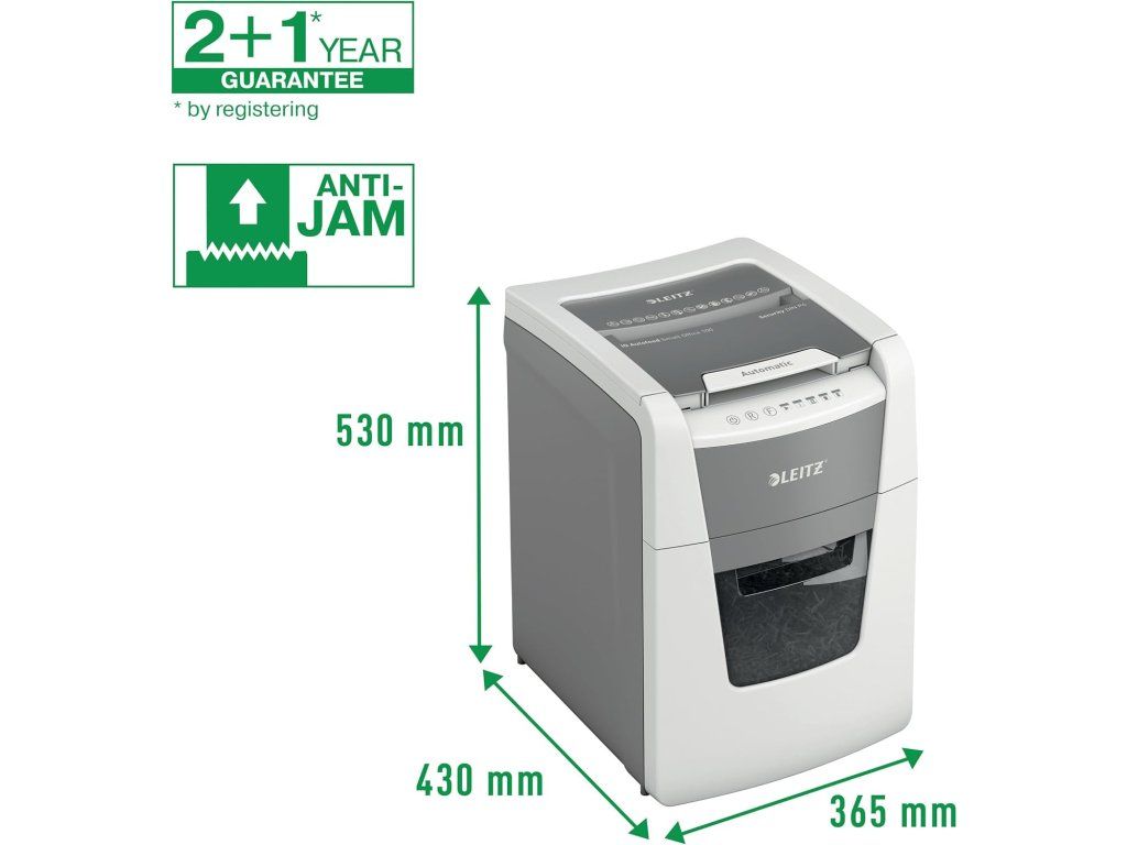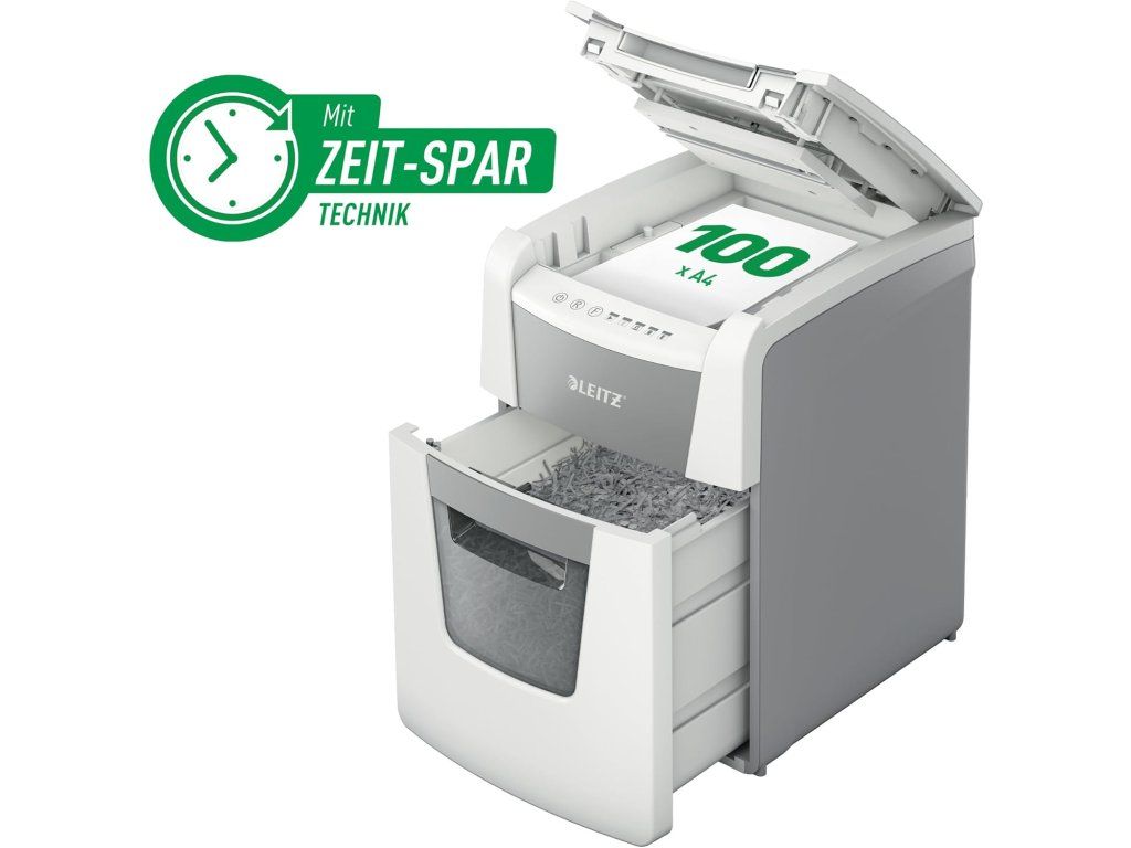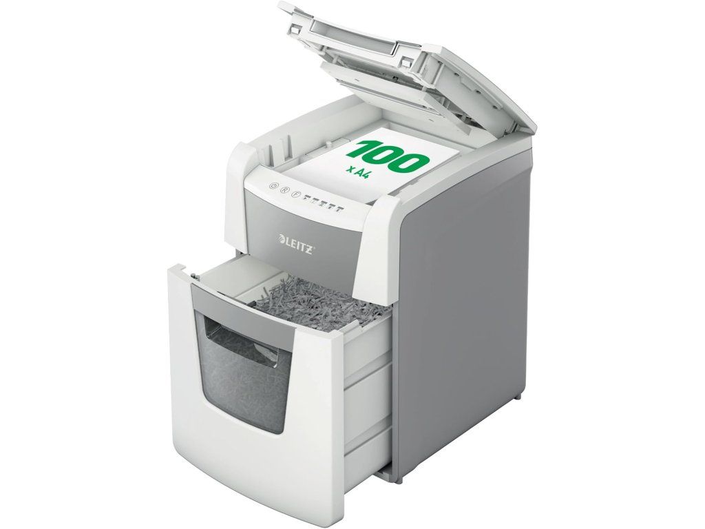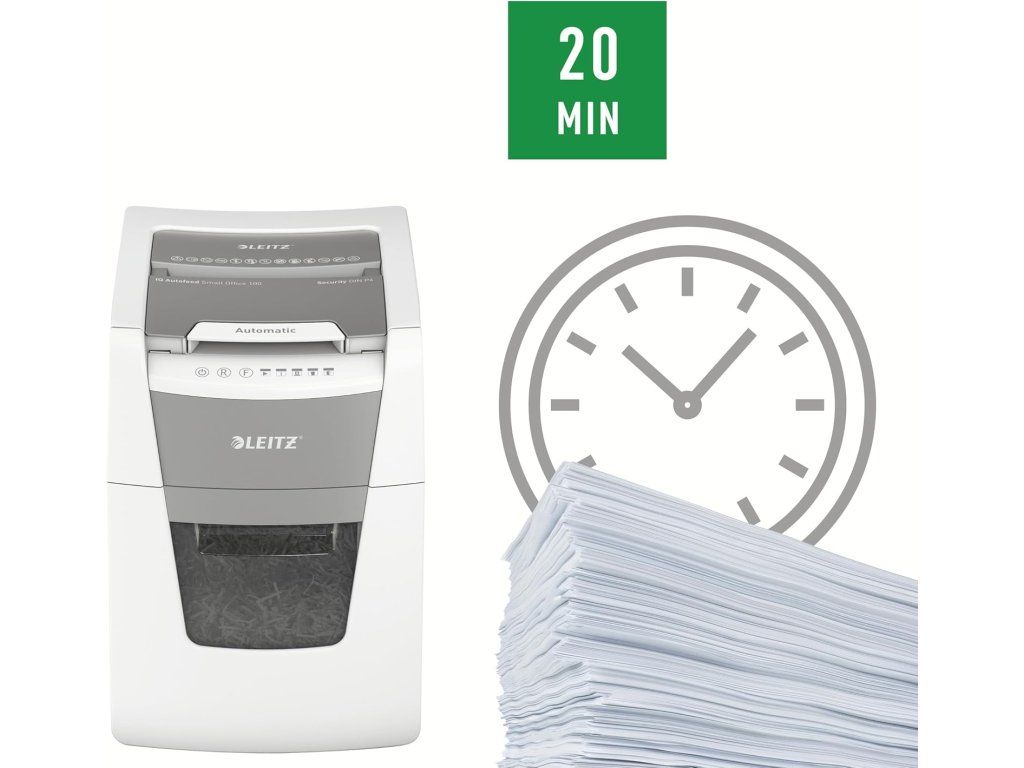 Leitz IQ Autofeed Small Office 100 skartovačka P4, křížový řez 4 × 28 mm, 100 listů, koš 34 l, bílá