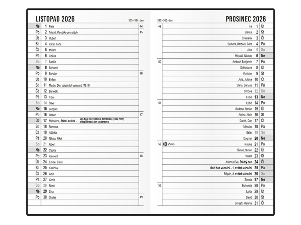 Osobní záznamy, důležitá telefonní čísla, tabulkový kalendář 2026, roční plánovací kalendář 2026, abecední seznam jmen, adresář, místo na zapsání odjezdů a příjezdů autobusů a vlaků, místo na poznámky.