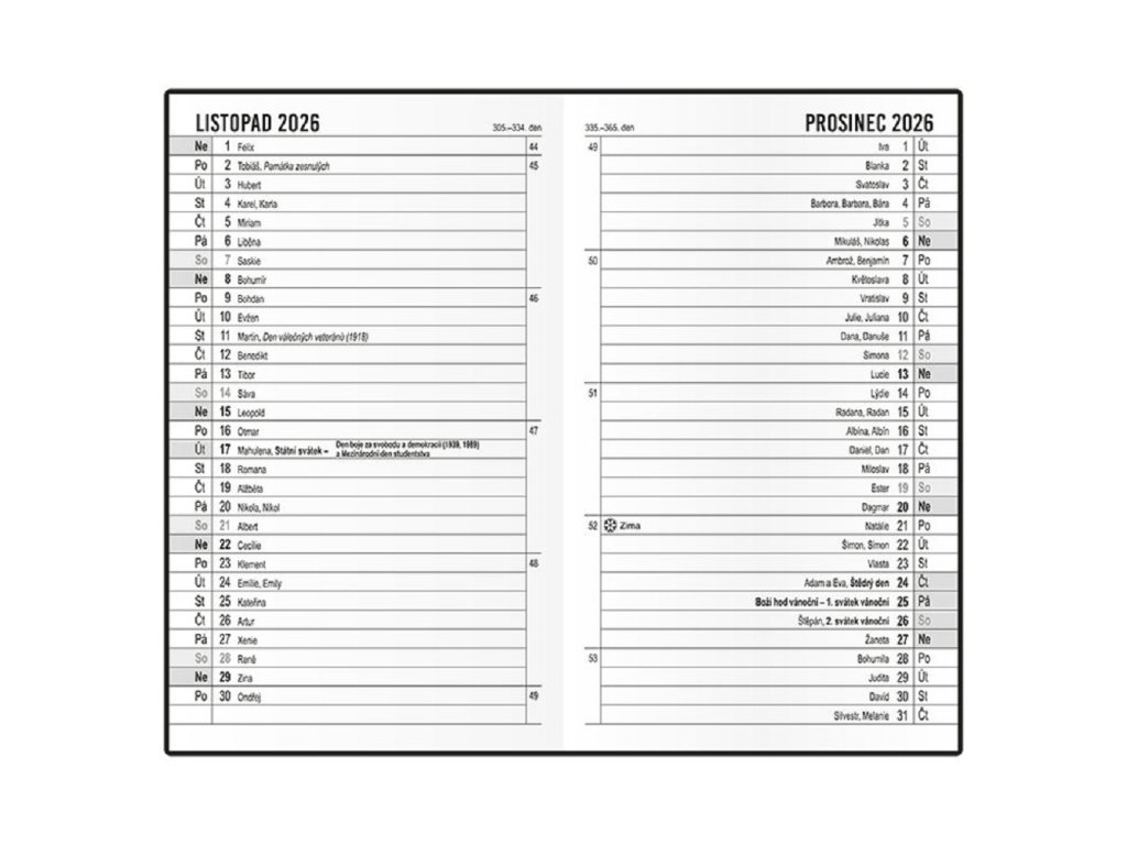 Osobní záznamy, důležitá telefonní čísla, tabulkový kalendář 2026, roční plánovací kalendář 2026, abecední seznam jmen, adresář, místo na zapsání odjezdů a příjezdů autobusů a vlaků, místo na poznámky.
