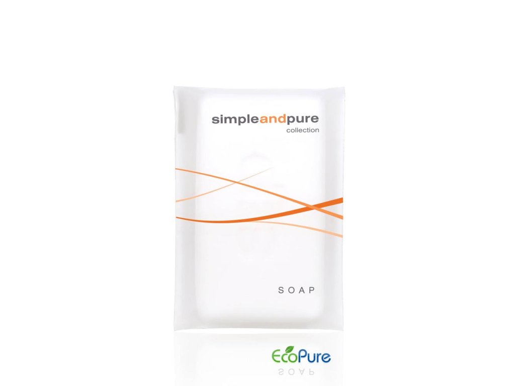 Toaletní hotelové mýdlo Simple and Pure o hmotnosti 15 g je součástí ekologicky šetrné kosmetické řady, navržené speciálně pro hotelový a ubytovací segment. Mýdlo má hranatý tvar a je baleno jednotlivě v biologicky rozložitelném sáčku s technologií EcoPure, která zajišťuje 100% rozložitelnost obalu. Obal je zároveň 100% recyklovatelný.