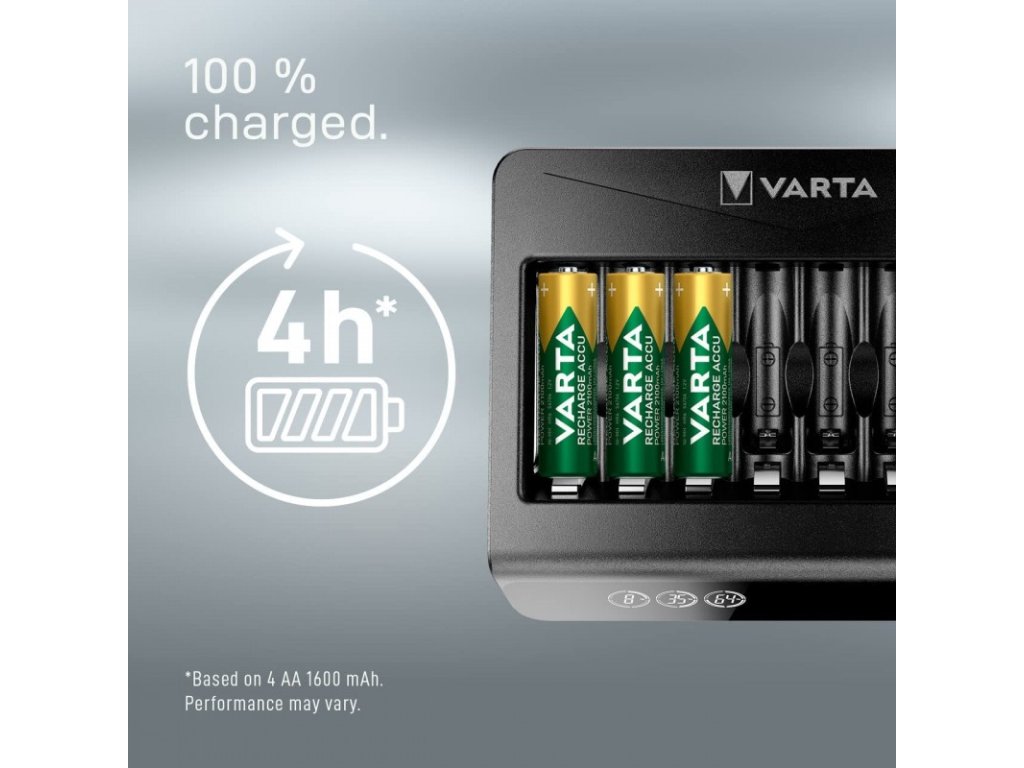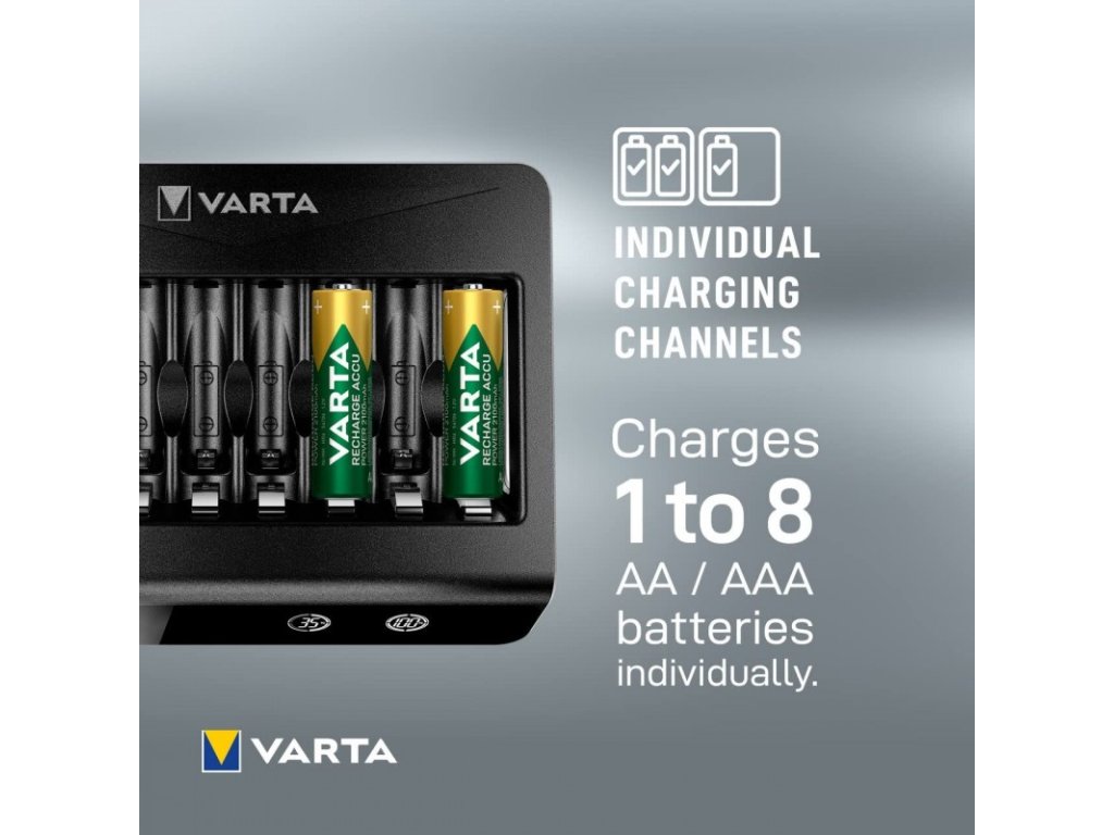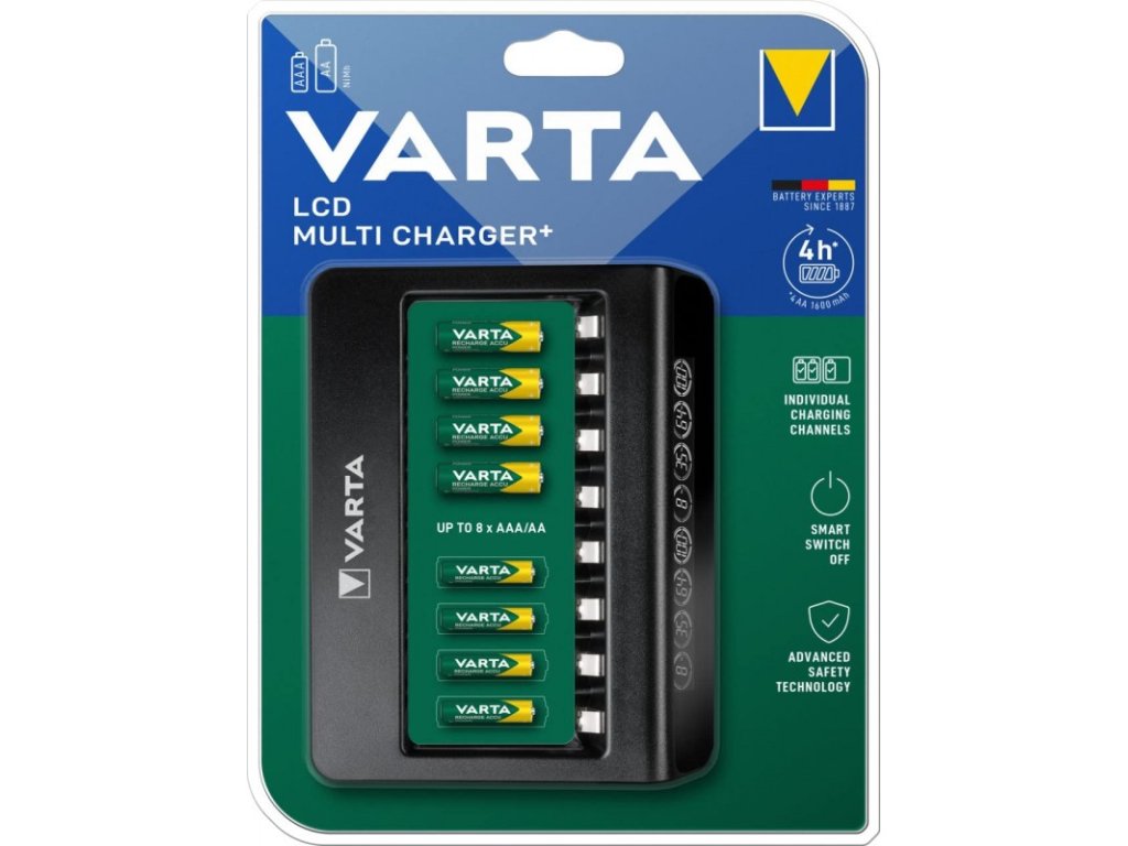 LCD Multi Charger+ od společnosti Varta je velmi praktická a skvěle vybavená nabíječka pro 1 až 8 AA/AAA baterií. Vyniká rychlostí, když čtyři AA baterie o kapacitě 1 600 mAh dokáže dobít během pouhých 4 hodin. Nabízí i časovač pro automatické vypnutí nabíjení.