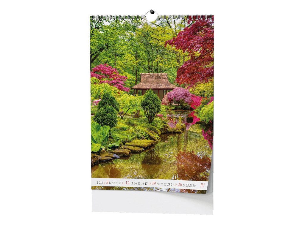 Nechte se inspirovat krásou zahrad po celý rok 2026 s tímto nástěnným kalendářem! Každý měsíc objevíte jiné zahradní zákoutí: prosluněné záhony s pivoňkami a okrasnými česneky, barevné azalky v japonské zahradě s jezírkem, detail skalky, podzimní posezení na terase, zimní idylu se zasněženými keři nebo zahradu s vodopádem a okrasnými trávami. Fotografie zachycují rozmanitost stylů i proměny zahrady během ročních období.