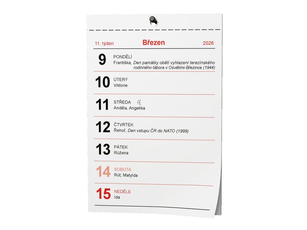 - Týdenní nástěnný kalendář trhací. Formát A6 - 100 x 147 mm, počet listů 57, v horní zpevněné liště otvor na zavěšení.