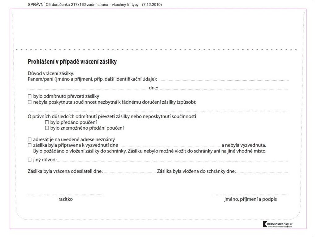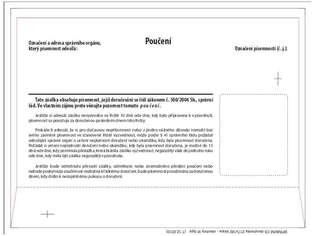 - Obálky s vytrhávací doručenkou a odtrhovacím poučením (dle zákona č. 500/2004 Sb. Správní řád)