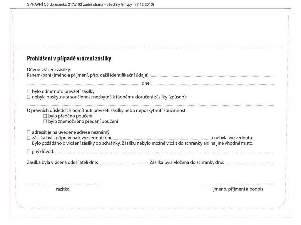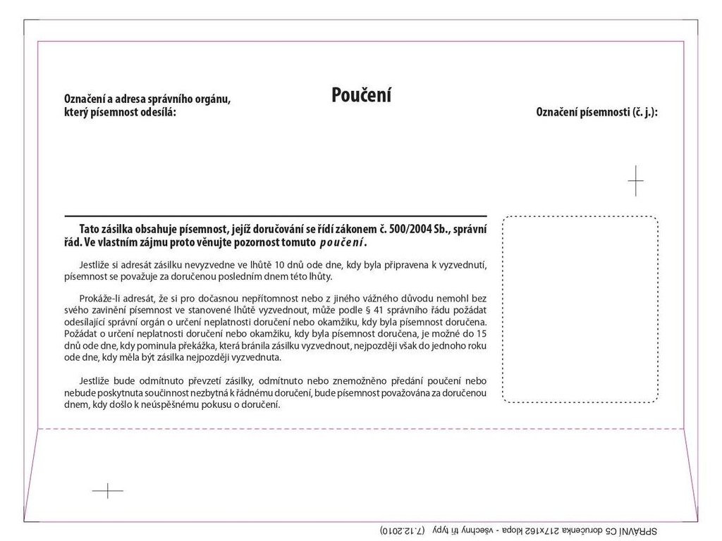 - Obálky s vytrhávací doručenkou a odtrhovacím poučením (dle zákona č. 500/2004 Sb. Správní řád)