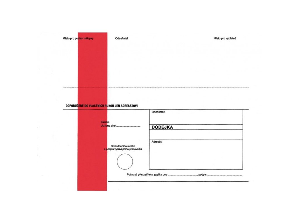 - Obálky formátu C5 s Dodejkou ve formě vytrhávacího okénka (okénko se v perforaci vytrhne z těla obálky), podlepeného samopropisujícím papírem, bez pruhu, s modrým nebo červeným pruhem.