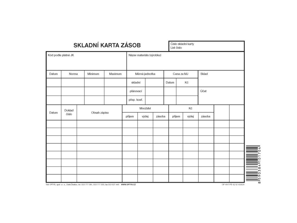 OPTYS 1017, Skladní karta zásob A5