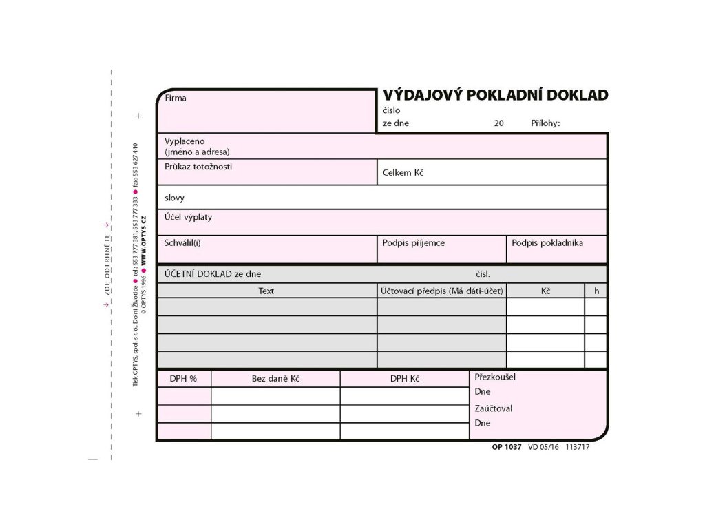Výdajový pokladní doklad OPTYS 1037 je určený pro evidenci hotovostních výdajů v rámci pokladny, účetnictví nebo finančních operací firmy. Díky svému provedení je vhodný pro podvojné účetnictví a splňuje všechny aktuální požadavky zákona o DPH. Slouží k přehlednému záznamu vyplacené částky, účelu, data, sazby DPH, podpisu odpovědné osoby i dalších doplňujících údajů.
