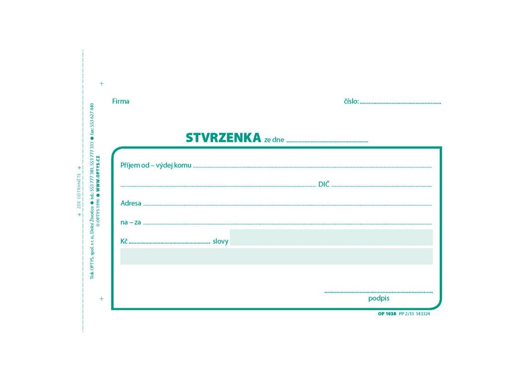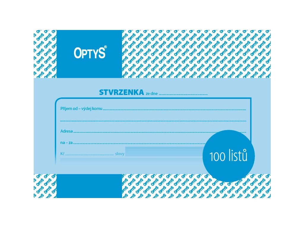 Stvrzenka OPTYS 1038 je praktický formulář určený pro potvrzení převzetí hotovosti, dokumentů, materiálu nebo jiných předmětů. Slouží jako doklad o uskutečněné transakci mezi dvěma stranami a umožňuje jasné zaznamenání částky nebo popisu převzaté položky, data, podpisu a doplňujících informací. Je vhodná pro firmy, živnostníky, služby i interní administrativu ve skladech a kancelářích.