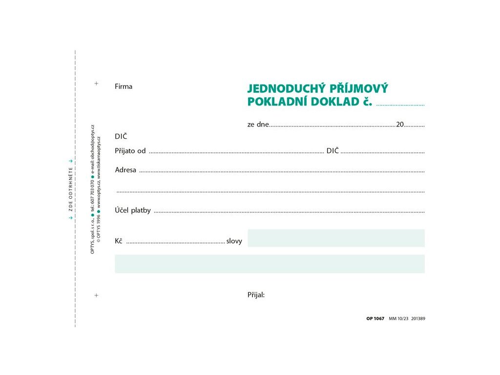 Příjmový pokladní doklad OPTYS 1067 je jednoduchý formulář určený pro evidenci přijatých hotovostních plateb. Slouží k rychlému a přehlednému vystavení potvrzení o přijetí peněz, zaznamenání částky, účelu platby, data a podpisu. Je ideální pro každodenní práci v pokladně obchodů, provozoven, služeb, kanceláří i menších podnikatelů.