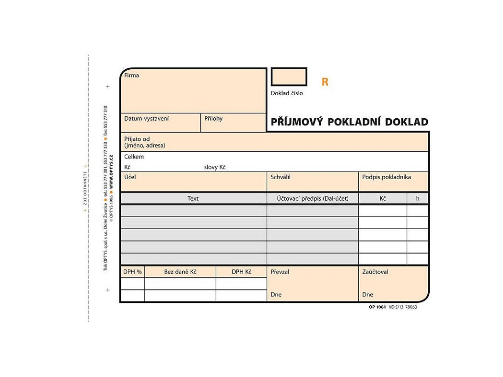OPTYS 1081, Příjmový doklad A6, samopropisovací, číslovaný, 2 x 50 listů