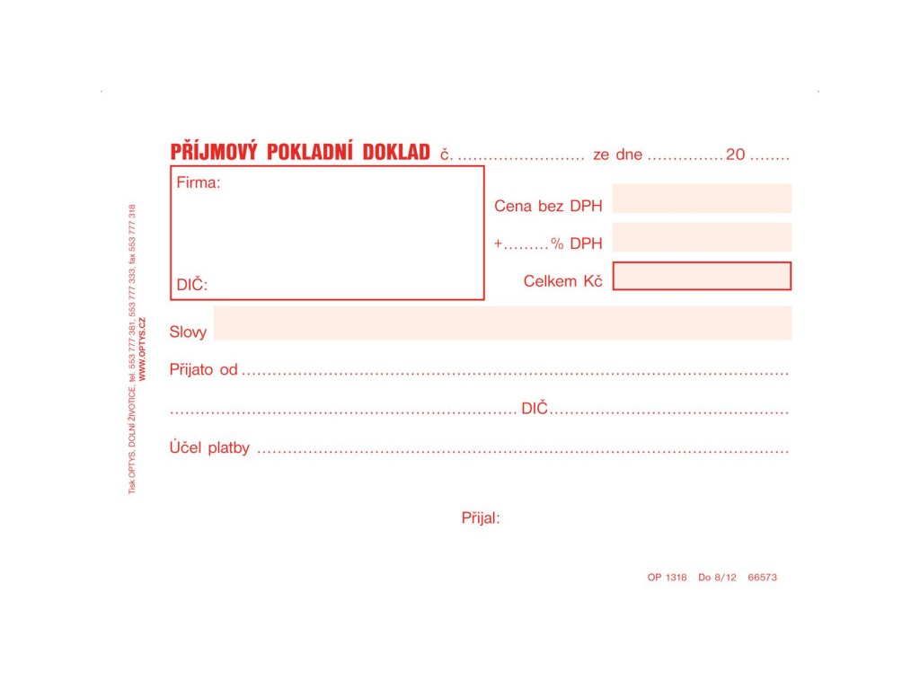 OPTYS 1318, Příjmový doklad A6, jednoduchý, samopropisovací, 50 listů