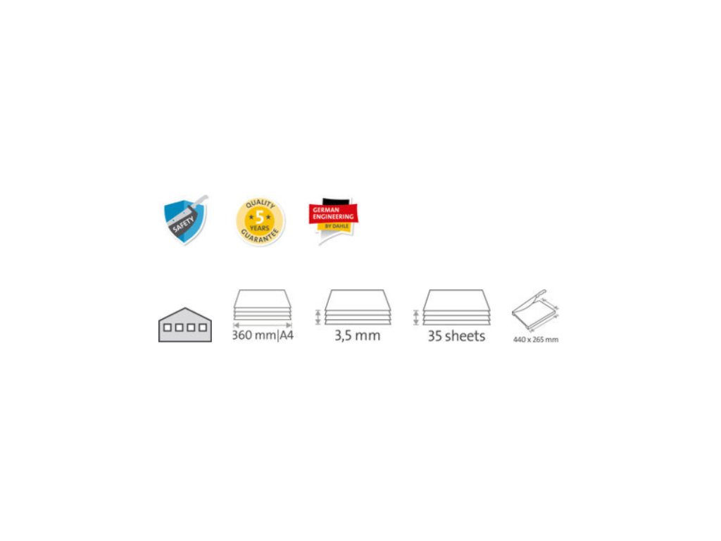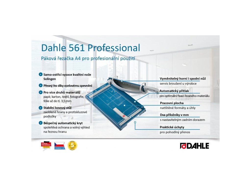 Páková řezačka Dahle 561 (00561-21285) je bezpečnostní řezačka na papír, karton a jiné materiály s automatickým přítlakem materiálu. Řezání až do maximální délky 550 mm a výšky 3,5 mm.