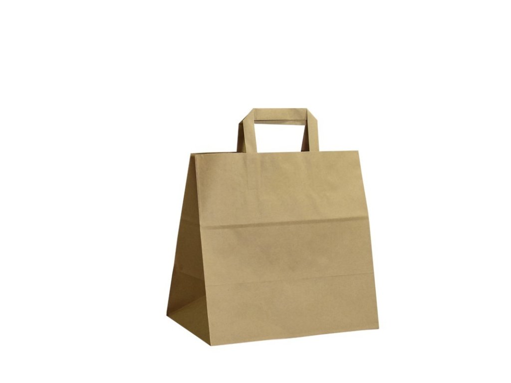 - Rozměrově vetší hnědá papírová taška s plochým uchem s velmi rozšířeným dnem nejen pro menu box.