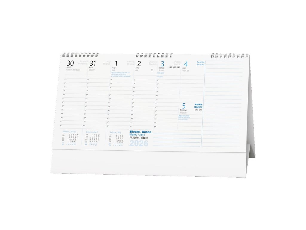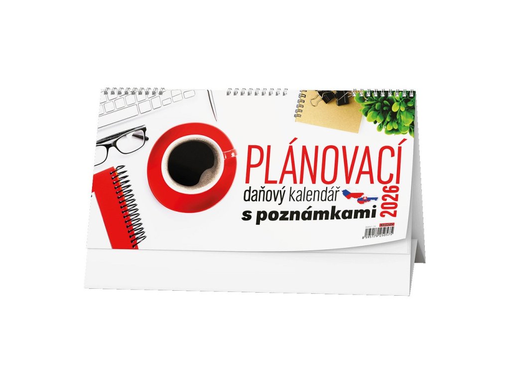 Stolní plánovací daňový kalendář na rok 2026 s rozšířeným prostorem pro poznámky. Týdenní kalendárium s hodinovými řádky (Po-Pá) a sloupci pro víkend. Zahrnuje důležité daňové termíny, české a slovenské jmenné kalendárium a svátky. Obsahujetaké přehled 3 měsíců. Ideální pro detailní plánování.