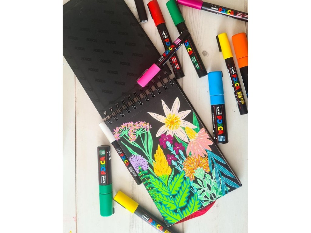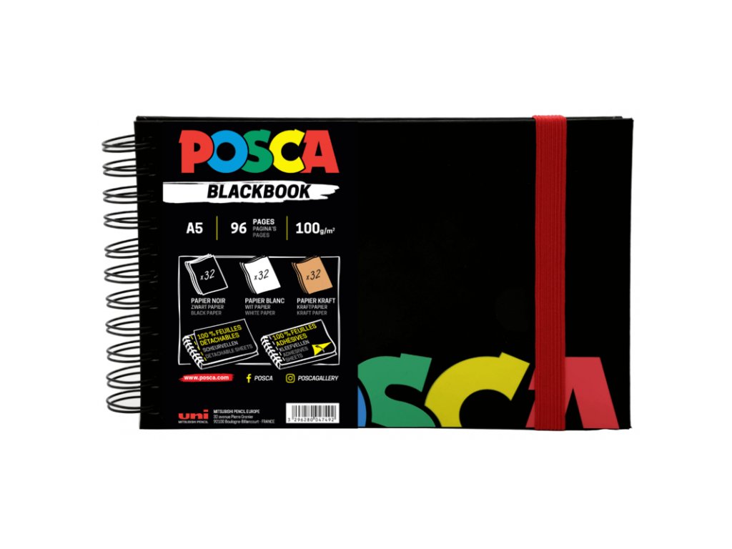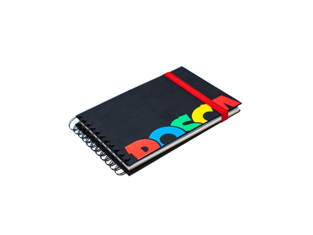 Skicák POSCA má pevné matně černé desky s barevným logem POSCA a širokou červenou gumičkou chránící skicák před otevřením. Sami si můžete zvolit podklad podle příležitosti, situace nebo nálady. K dispozici je 16 černých, bílých a přírodních stránek v barvě kartonu. Kroužková vazba zajistí snadné listování a perforace jednoduché vytržení listu. Skicák lze díky své velikosti uložit i do menší tašky nebo kabelky. Zadní strana listu je samolepicí a umožňuje tak přenesení hotového díla mimo skicák.