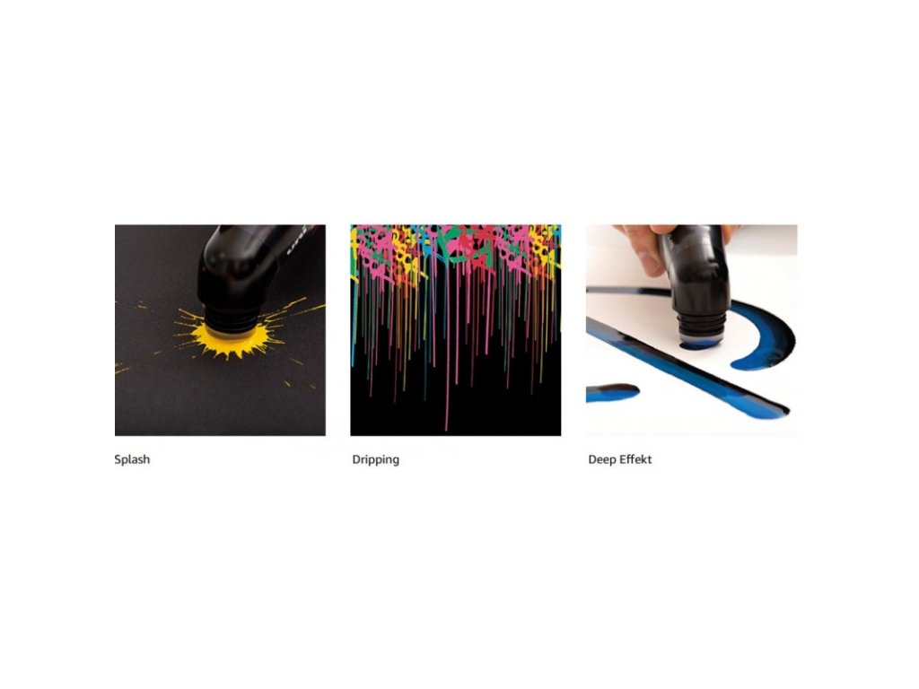 Nový velkoformátový popisovač s kulatým hrotem a dokonalým úchopem pro XXL projekty. Lze ho používat jak na svislých, tak i na vodorovných plochách. Umožňuje rychlou práci, je ideální na vyplnění velkých ploch několika tahy nebo velmi širokou linku. A pokud chcete docílit efektu tekoucí barvy, stačí ho otočit. Je intuitivní a zábavný, dokonalý nástroj, který uspokojí i ty nejdivočejší nápady.