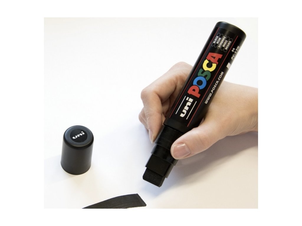 Popisovač POSCA PC-17K slouží k vytváření výrazných tahů, ploch a pozadí na velkých plochách. Je určen pro práci na výlohách, tabulích, nábytku, stěnách a dalších rozměrných površích, kde je požadováno rychlé a rovnoměrné krytí barvou.