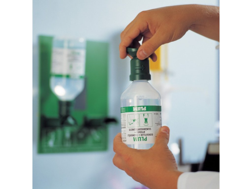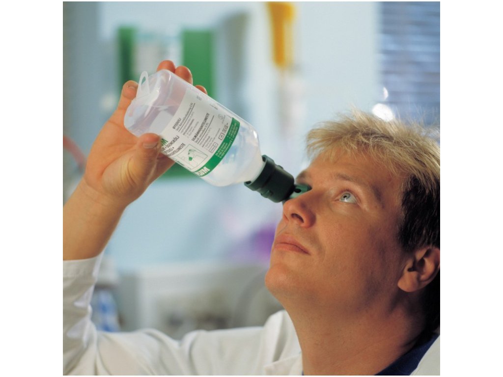 - Proto je důležité, aby na každém pracovišti, kde je nebezpečí zranění oka, byl roztok na výplach očí na dostupném a snadno přístupném místě.