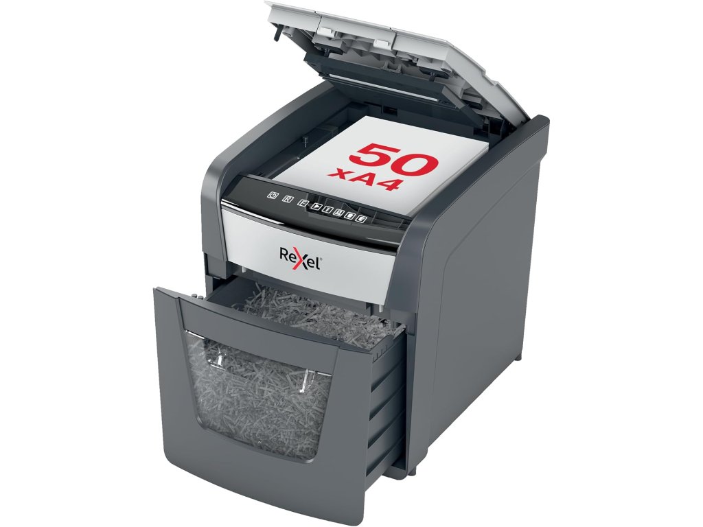 Skartovací stroj slouží k bezpečné likvidaci důvěrných dokumentů formátu A4 pomocí automatického podávání až 50 listů (80 g/m2) najednou. Umožňuje také manuální podání až 6 listů. Skartuje papír, kreditní karty, kancelářské sponky i drátky sešívaček bez nutnosti jejich odstranění.