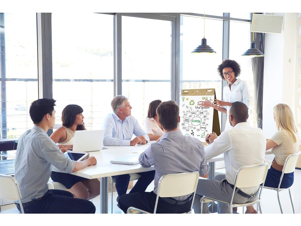 Flipchart má stolní provedení a je vybaven praktickým uchem na přenášení, díky kterému jej lze snadno vzít na školení, meeting nebo brainstorming. Jednotlivé listy mají formát 500 × 585 mm, což poskytuje dostatečný prostor pro poznámky i nákresy.