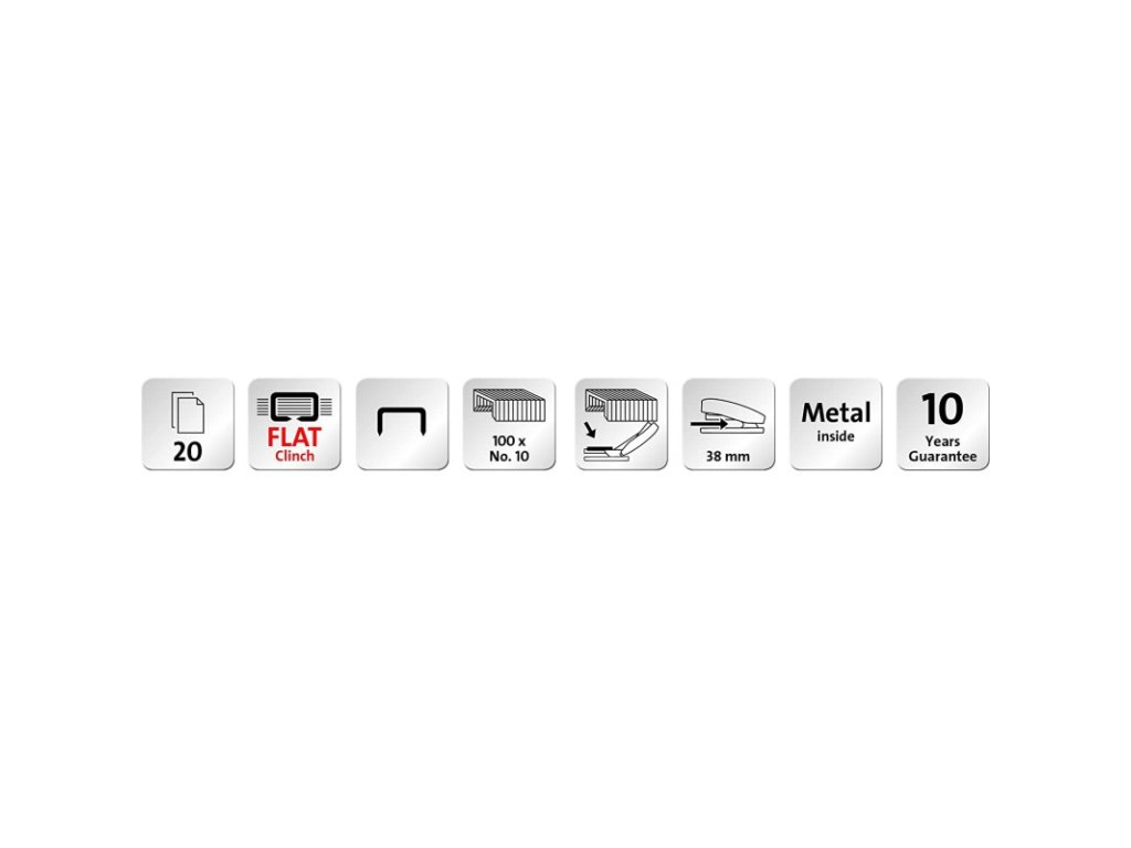 Malá sešívačka s funkcí Flat Clinch - plochým sešíváním, úspora místa v pořadačích. Celokovová s plastovým opláštěním. Integrovaný odstraňovač sponek z kovu. Plnění shora s jednoduchým vedením sponek. Kapacita: 100 kusů sponek No. 10. Balení vč. 200 sponek č. 10 SUPER. Prodloužená záruka: 10 let.