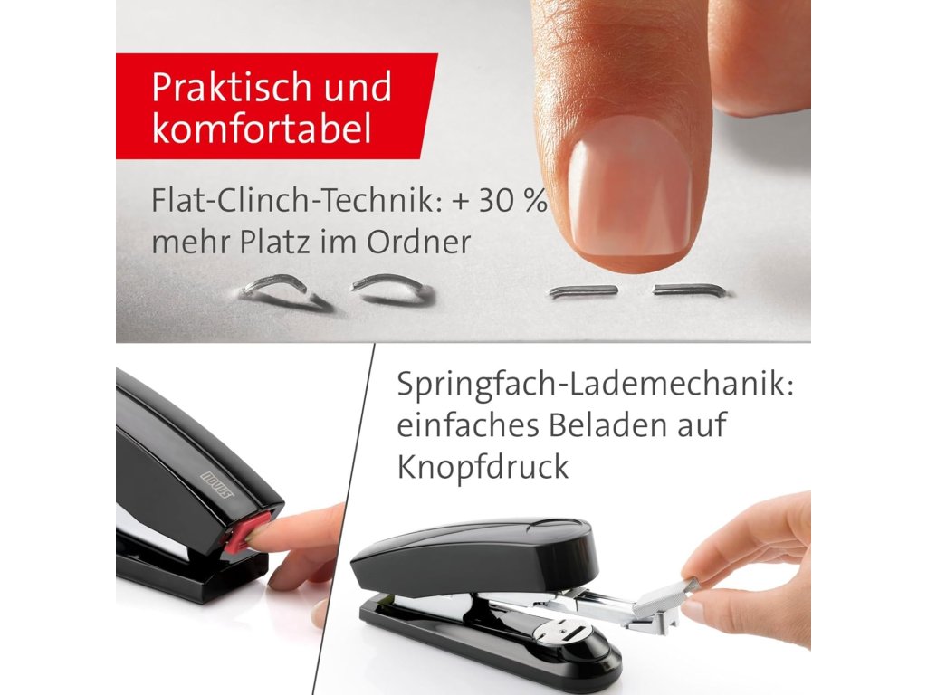 Spolehlivá kancelářská sešívačka s plochým sešíváním pro každodenní profesionální použití. Celokovový výrobek s plastovým pláštěm. Dvojité vedení sponek pro přesné sešívaní. Technologie Flat Clinch plochého sešívání pro úsporu místa v pořadačích. Stlačením tlačítka na sešívačce vyjede zásobník na spony. Max. hloubka vkládání papíru 60 mm. Kapacita: 100 kusů sponek 24/6 až 24/8 a 26/6 až 26/8, 150 kusů sponek 26/6 až 26/8 Super. Hmotnost: 265 g. Balení vč. 200 sponek 24/6 DIN SUPER. Prodloužená záruka: 25 let.