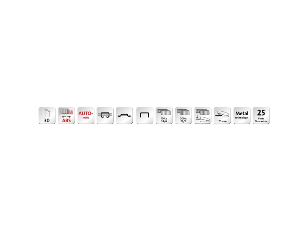 Komfortní sešívačka s patentovanou automatickou technologií pro snadné sešití až 8 listů stiskem jednoho prstu. Navíc ABS - antiblokovací systém pro bezporuchové sešívání. Celokovová s plastovým opláštěním. Hloubka vkládání 105 mm. Dvojité vedení sponek pro přesné sešívaní. Otočná matrice pro trvalé nebo volné sešití . Stlačením tlačítka na sešívačce vyjede zásobník na spony. Kapacita: 150 kusů sponek 24/6, 200 kusů sponek 26/6 Super. Balení: vč. 200 sponek 24/6 DIN SUPER. Prodloužená záruka: 25 let.