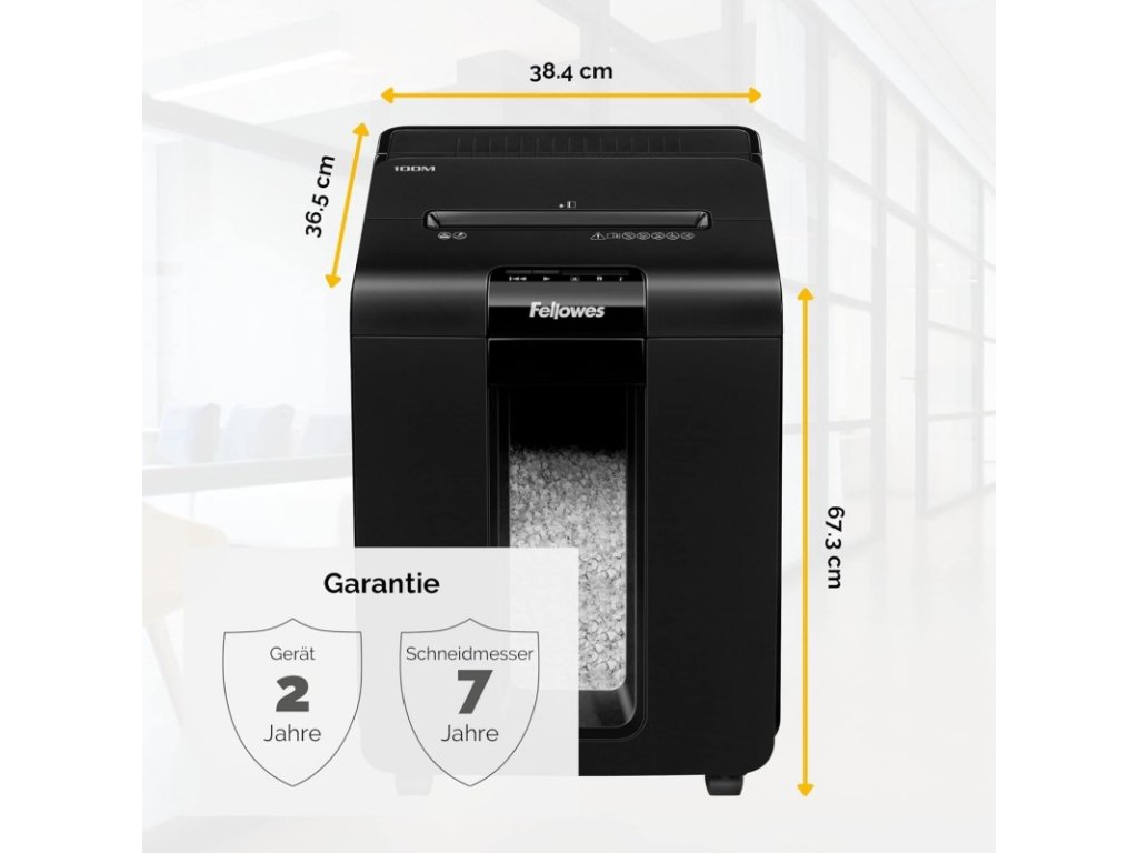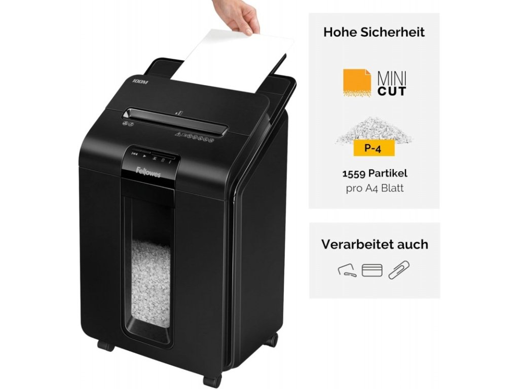 až 100 listů 70g papíru v křížovém miniřezu 4 x 10 mm. - Skartovač je vybaven vstupní štěrbinou pro ruční podání až 10 listů papíru. Řezací mechanismus zpracuje při manuálním podávání sešívačkou sešité papíry a kreditní karty. Pojezdová kolečka. Ovládání je zajištěno prostřednictvím dotykového panelu s LED podsvícením.