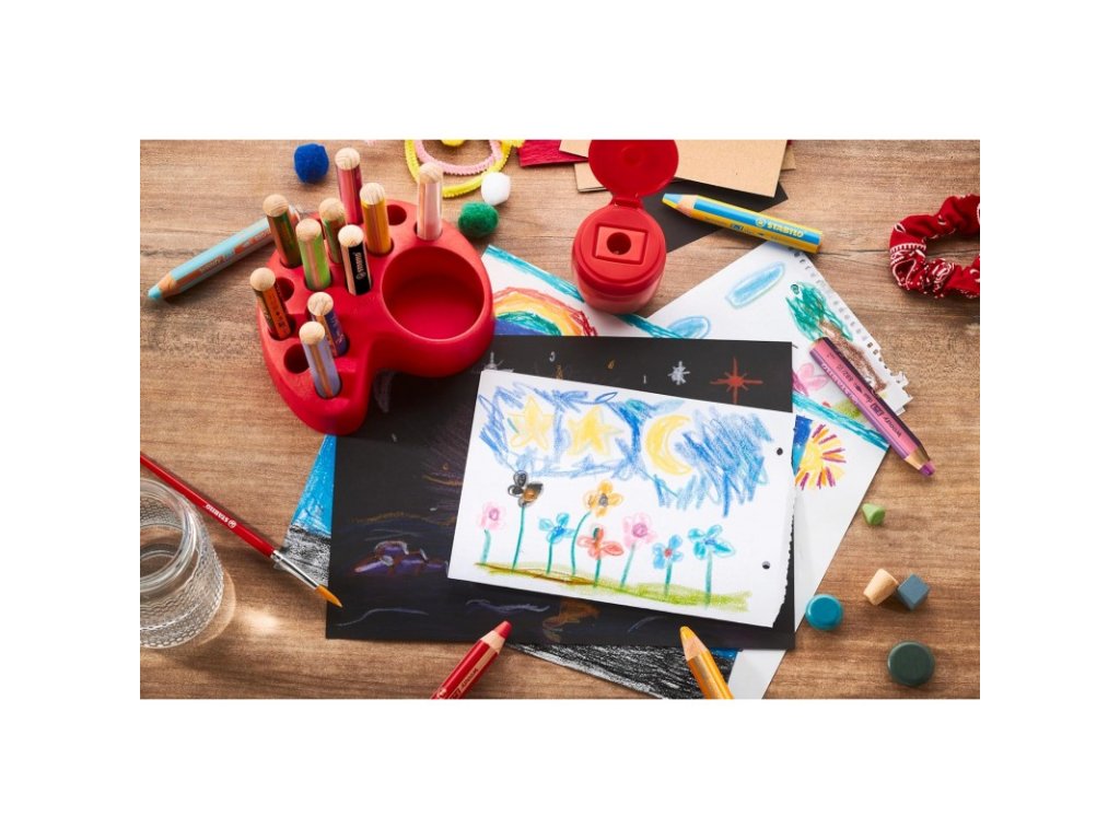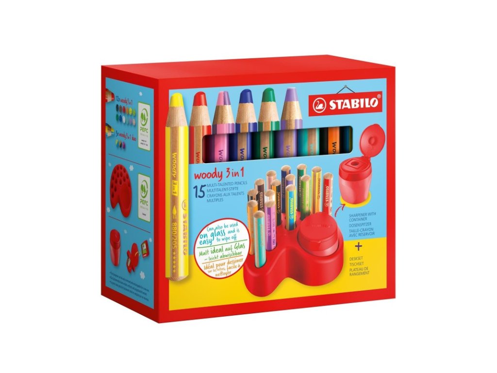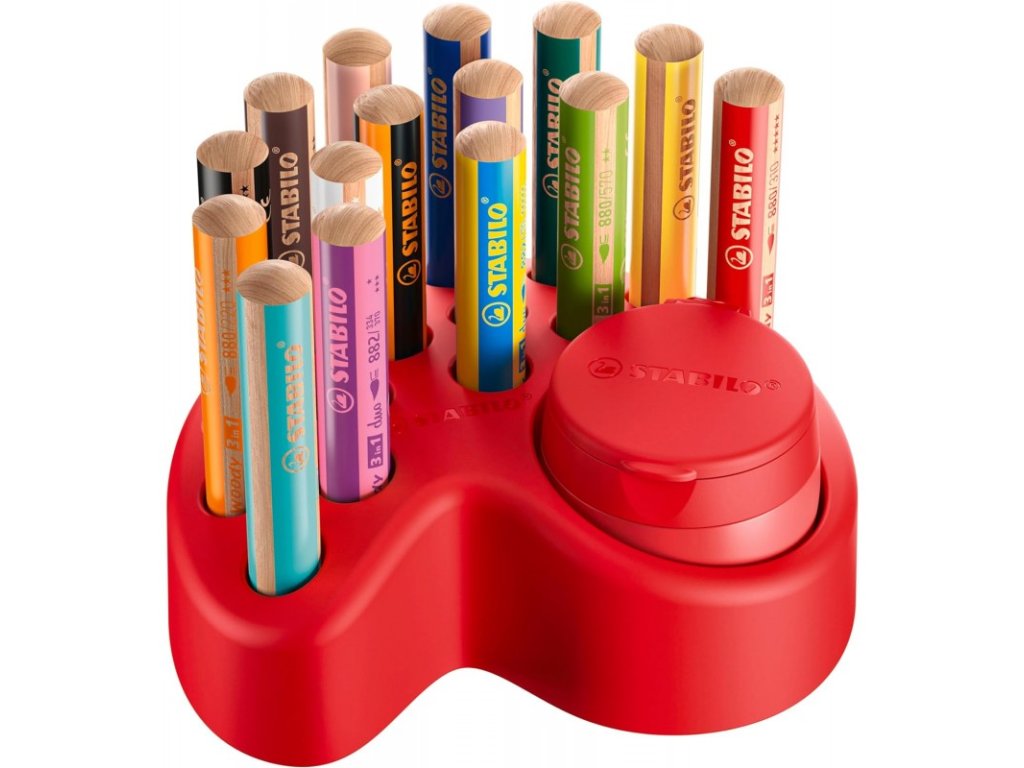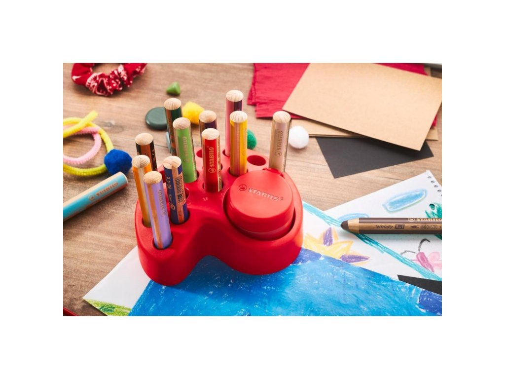 - Obsah sady: 15 barevných tužek Woody 3 v 1, 1 ořezávátko Woody s jedním otvorem a zásobníkem, 1 držák na stůl