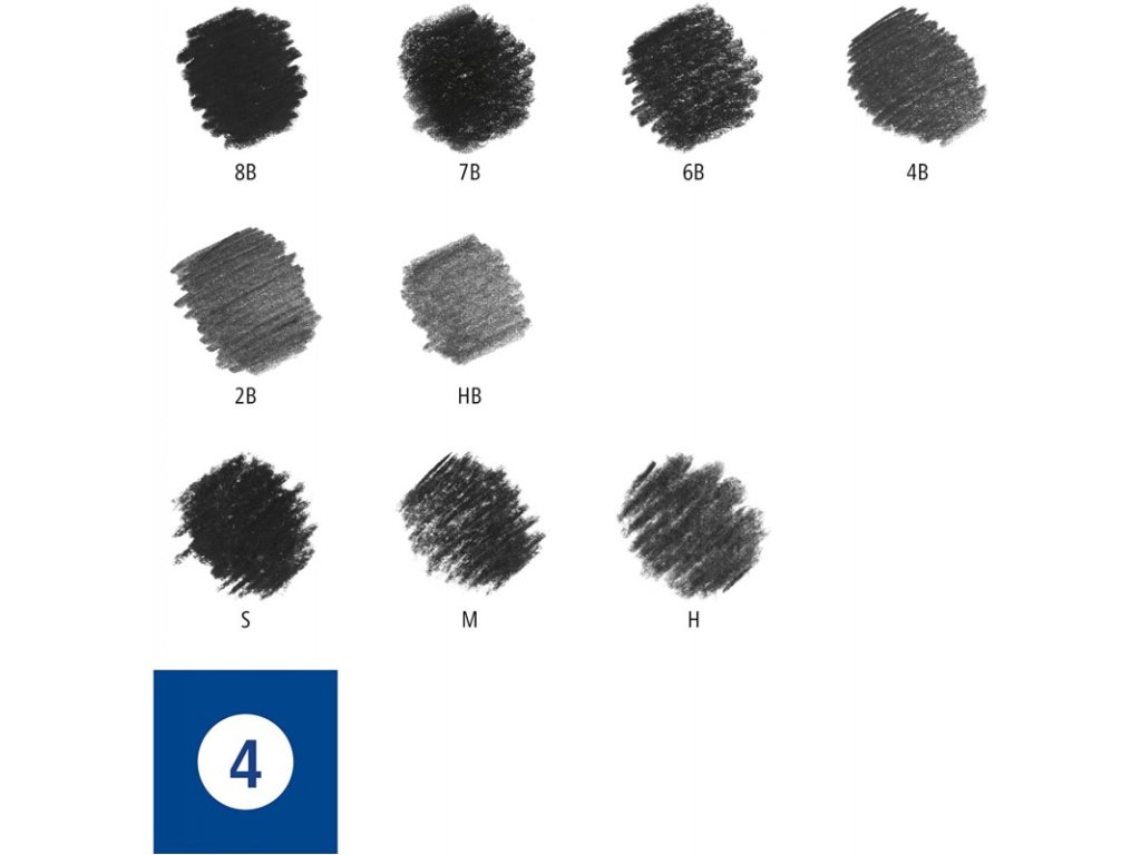 - Obsah balení: 6 tužek na kreslení (tvrdost HB, 2B, 4B, 6B, 7B, 8B), 3 tužky - uhly (tvrdost S, M, H), 1 papírovou stěrku, 1 gumu a 1 dvojité ořezávátko