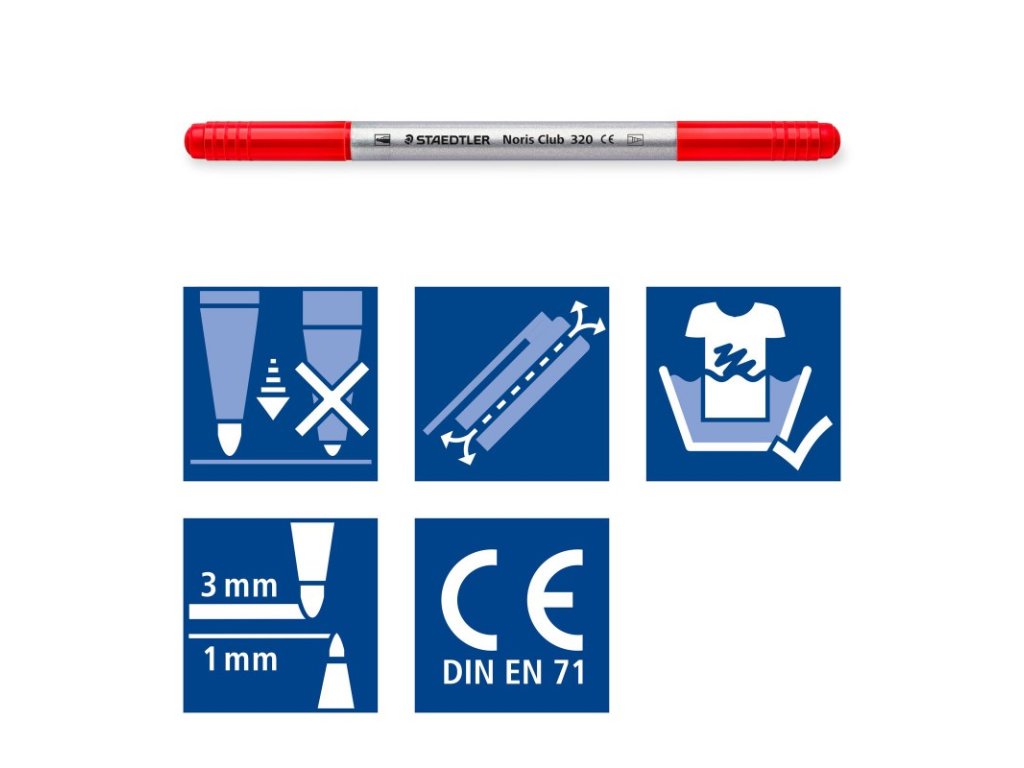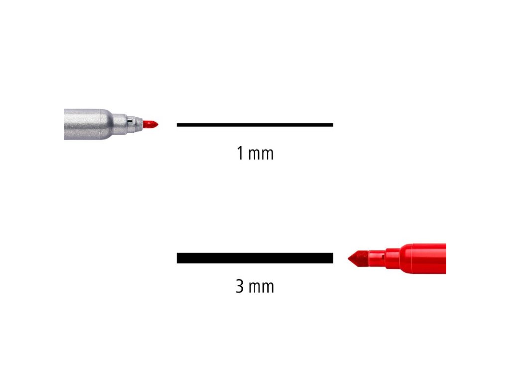 - Vlastnosti: odolný hrot proti zatlačení; oboustranné fixy (tenký a tlustý hrot); zářivé plné barvy; více možností použití; dlouhá životnost