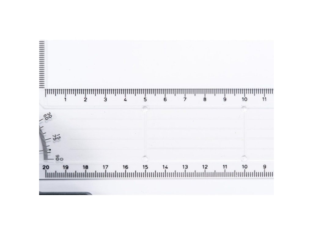 - Dvě průhledná pravítka s oboustrannými, protiběžnými stupnicemi