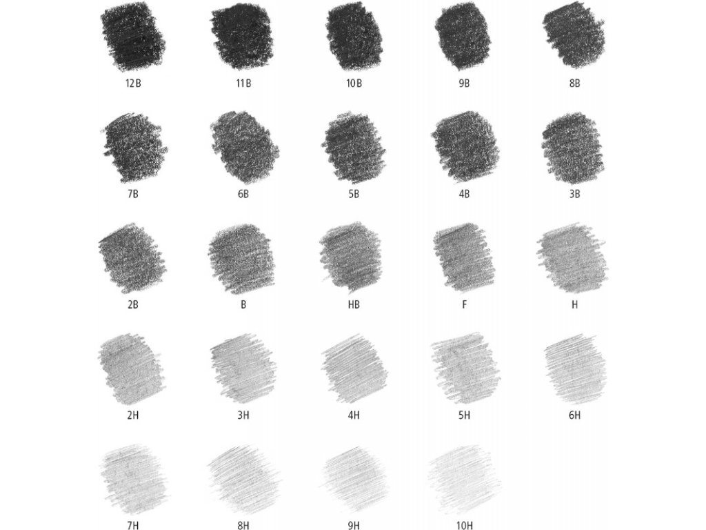 - Tvrdost: 12B, 11B, 10B, 9B, 8B, 7B, 6B, 5B, 4B, 3B, 2B, B, HB, F, H, 2H, 3H, 4H, 5H, 6H, 7H, 8H, 9H , 10H