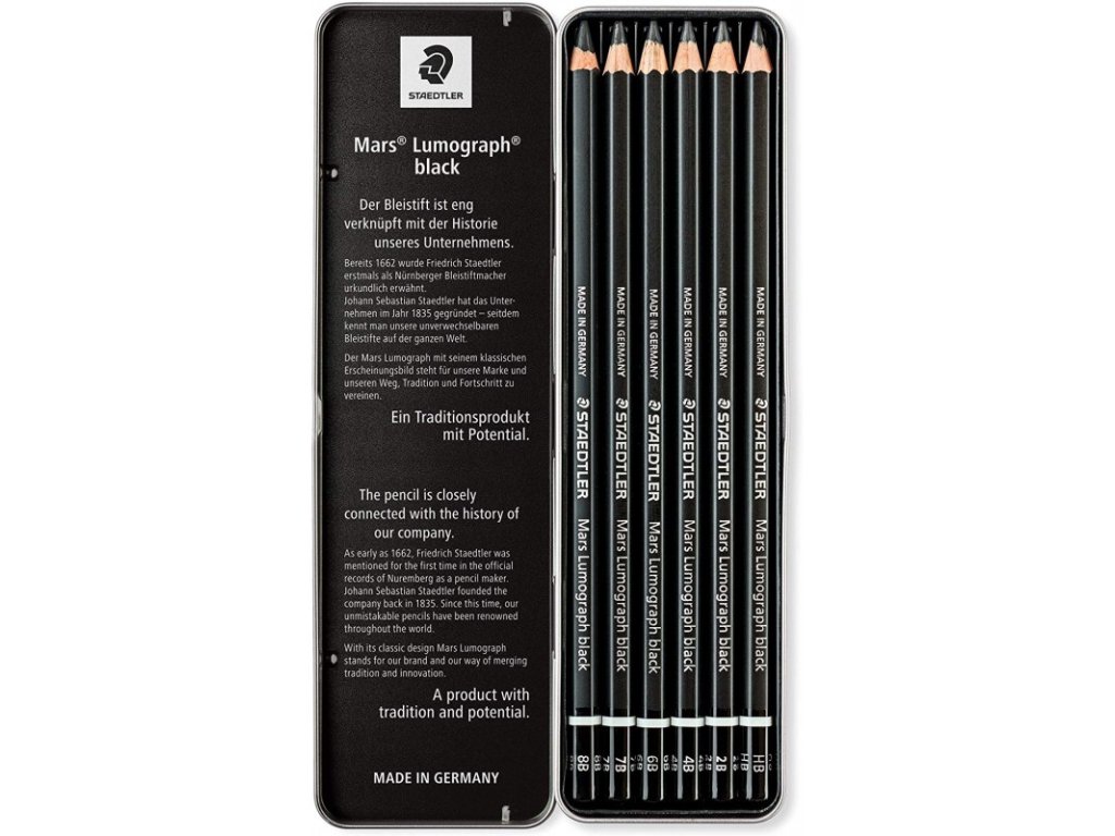 Staedtler Mars Lumograph Black 100B G6, sada uměleckých tužek 6 různých tvrdostí, v kovové krabičce