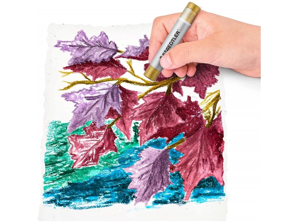 - Vysoce kvalitní olejové pastely v metalických odstínech pro lesklé barevné efekty na světlém i tmavém papíře
