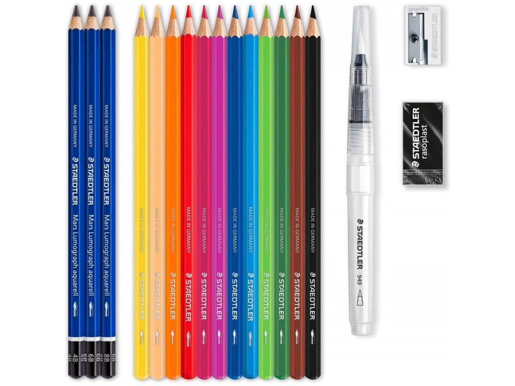 - Obsah balení: 3 prémiové akvarel tužky Mars Lumograph aquarell (tvrdost 4B, 6B, 8B), 12 akvarel tužky (12 barev), 1 vodní štětec (kulatý střední), 1 kovové ořezávátko