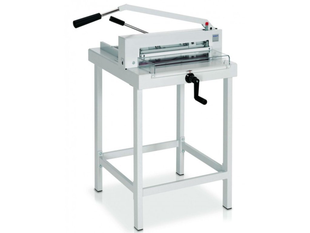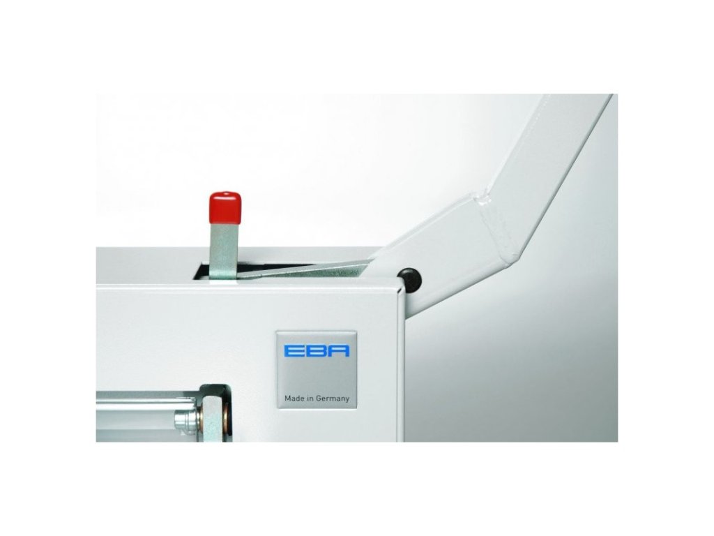 - Mechanická stohová řezačka vysoce kvalitního provedení značkového výrobce EBA, řezání až do formátu A3, délka řezu 430 mm, výška stohu 40 mm, hloubka vložení stohu 435 mm.