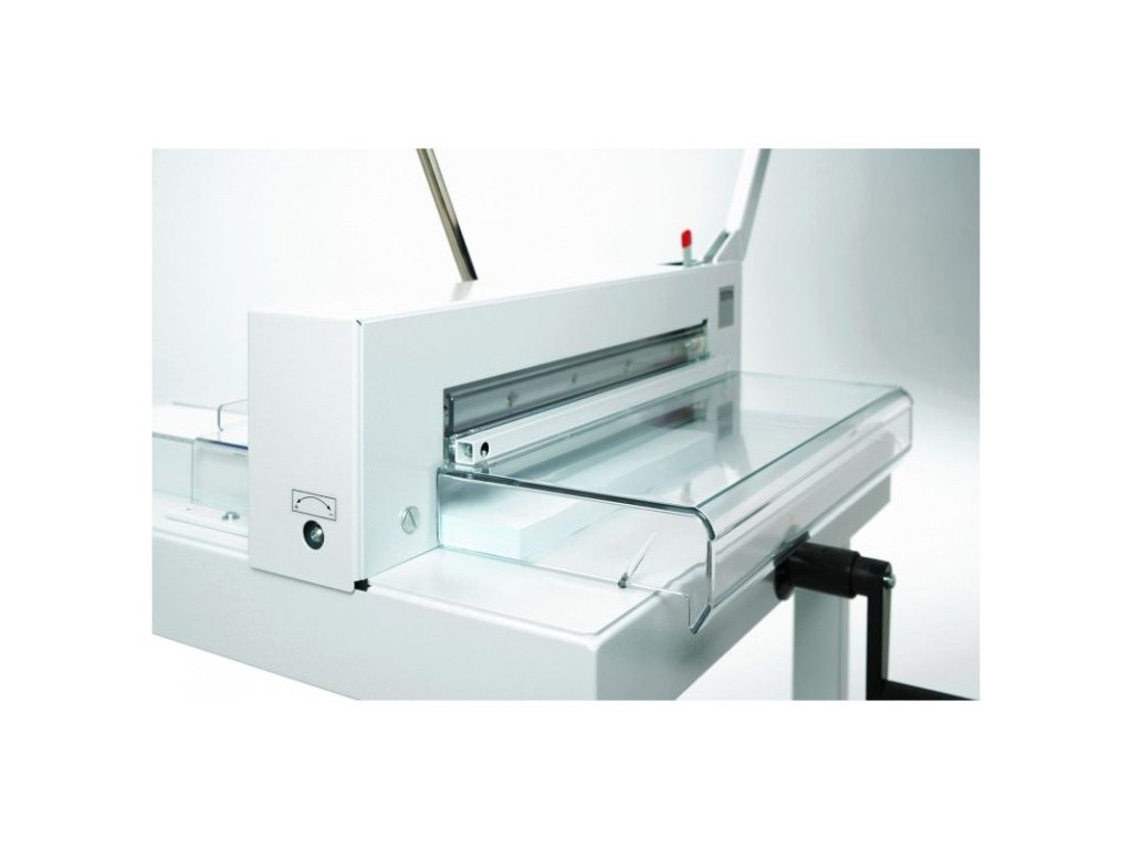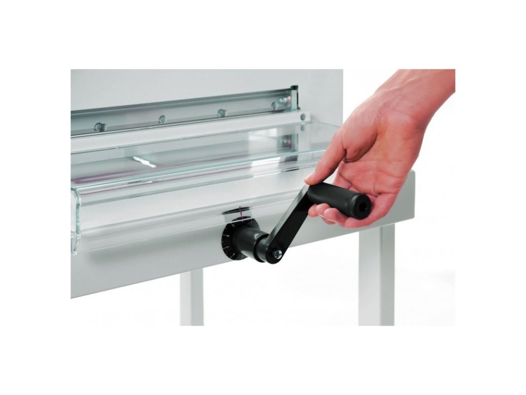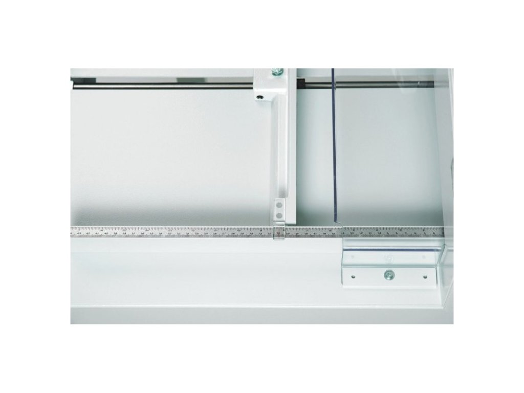 - doraz stohu papíru s mechanickým vřetenovým posuvem, velmi přesné nastavení díky stupnici na kličce vřetene, stupnice v mm