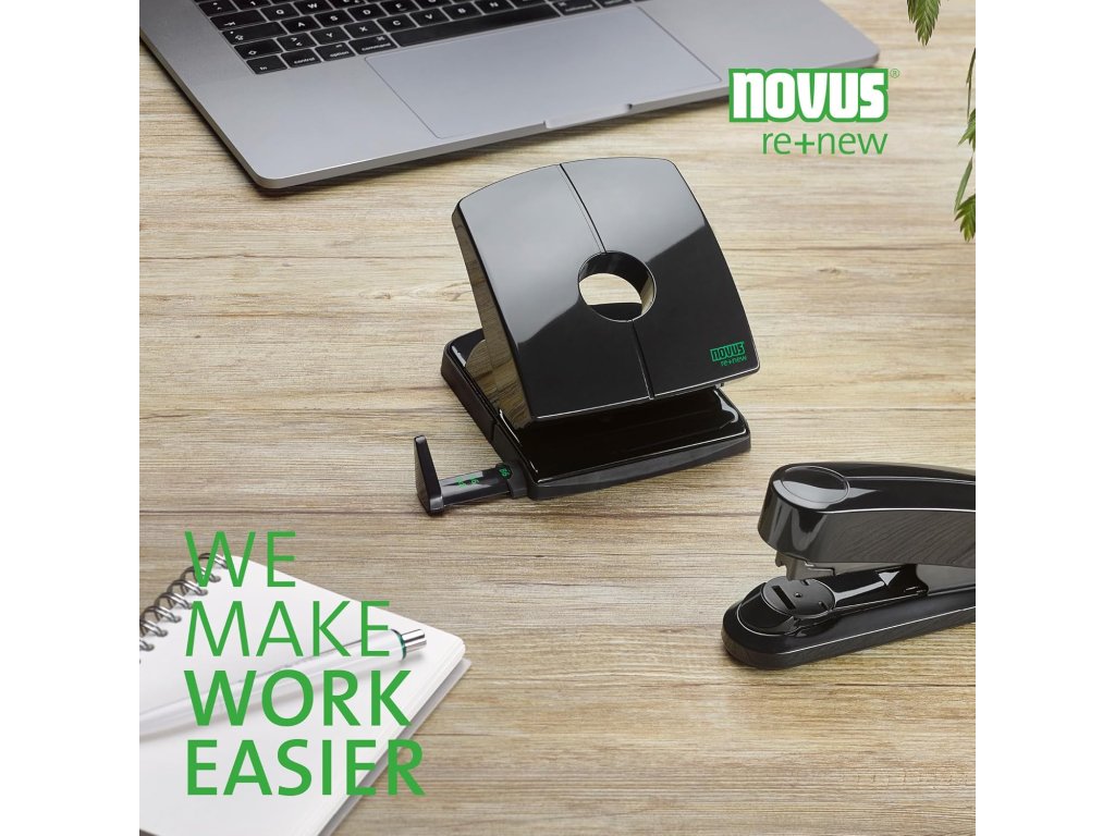 Vysoce výkonná a ekologicky šetrná děrovačka z řady NOVUS re+new spojuje moderní design, dlouhou životnost a udržitelnost. Vhodná pro každodenní použití v kanceláři.