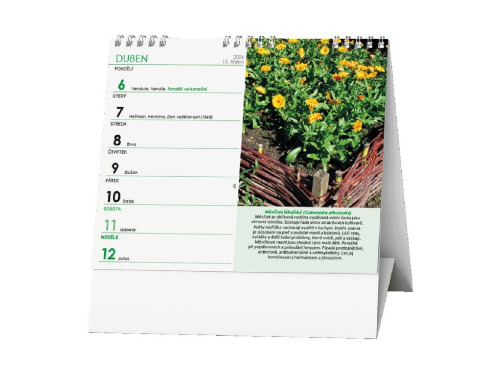 - objevte poklady přírody! Stolní kalendář Léčivé rostliny 2026 představuje každý týden jinou bylinku (měsíček aj.) s popisem účinků. Týdenní plánování a české kalendárium.