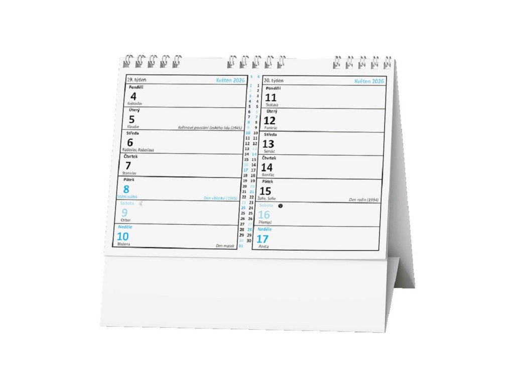 Stolní pracovní kalendář Impuls na rok 2026 s dvoutýdenním rozložením (2 týdny na stránce). Nabízí přehledné plánování s českými jmény, státními svátky, významnými dny, čísly týdnů a fázemi Měsíce. Ideální pro organizaci pracovních úkolů aschůzek. Čistý a funkční design.
